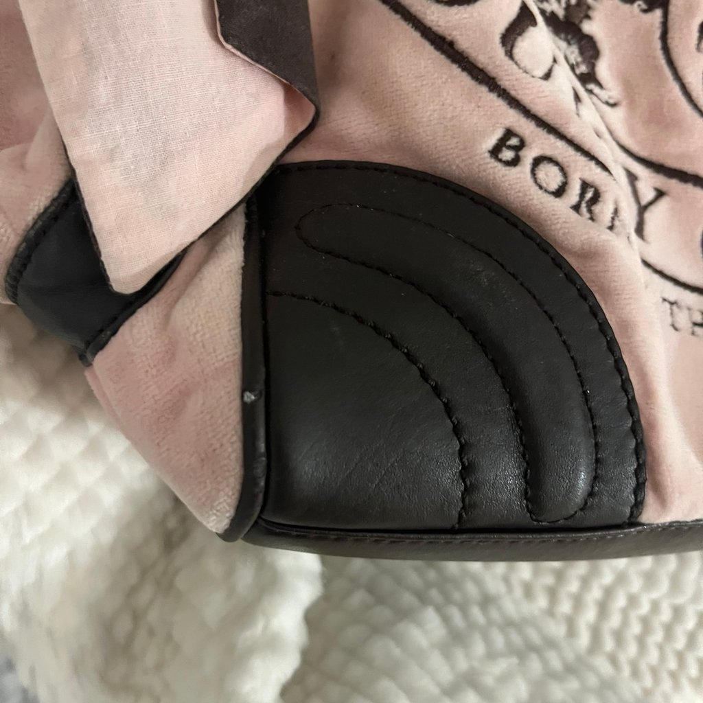 Original Pink Juicy Couture daydreamer bag with leather trim and gold and pink heart charm. Charm has some discoloration as you can see in the picture but isn’t noticeable when wearing the bag. Outside velour is in great condition with minimal peeling on the piping as pictured. I removed the zippers and key fob from inside the bag when I got it since it was peeling and damaged. Inside has some staining such as pen marks.