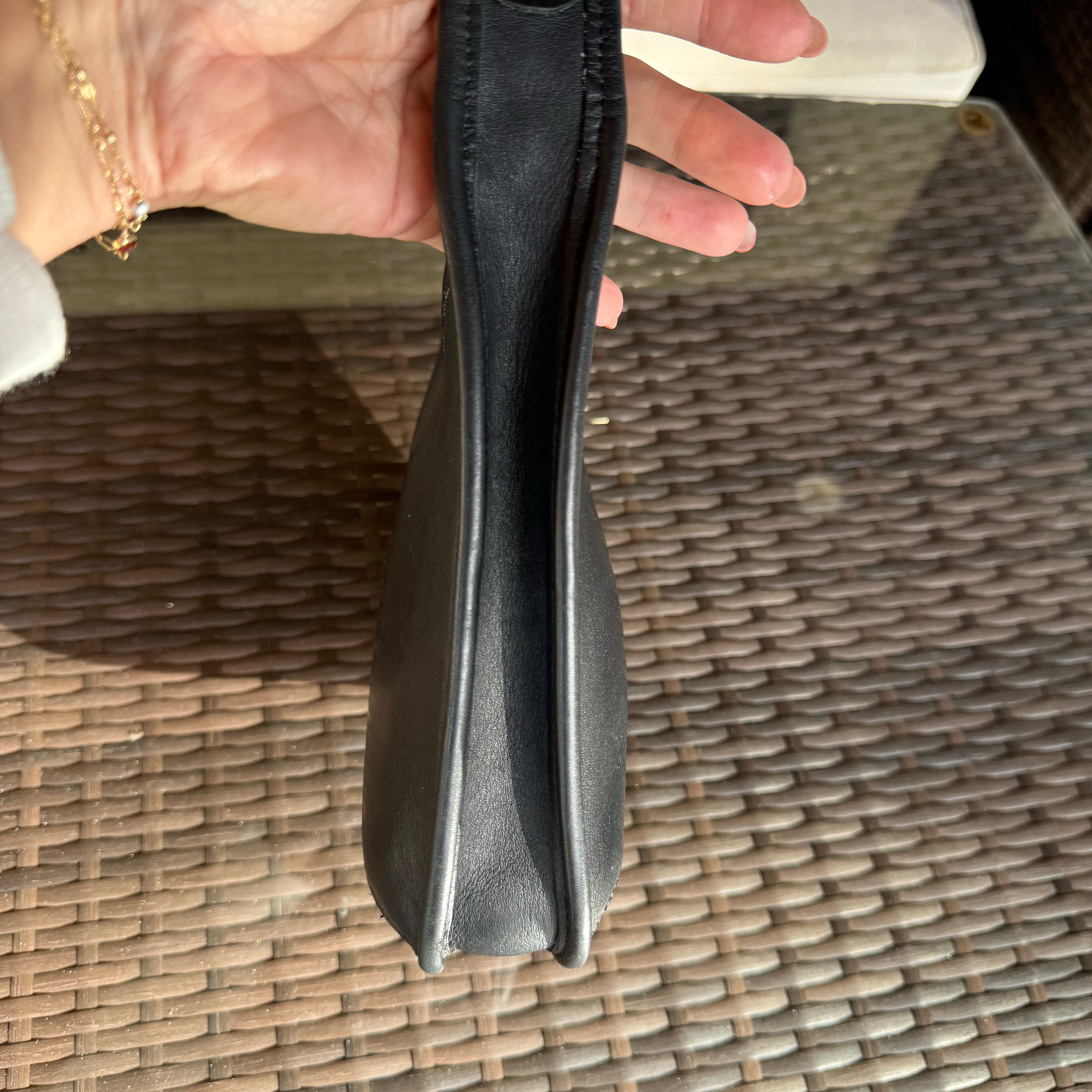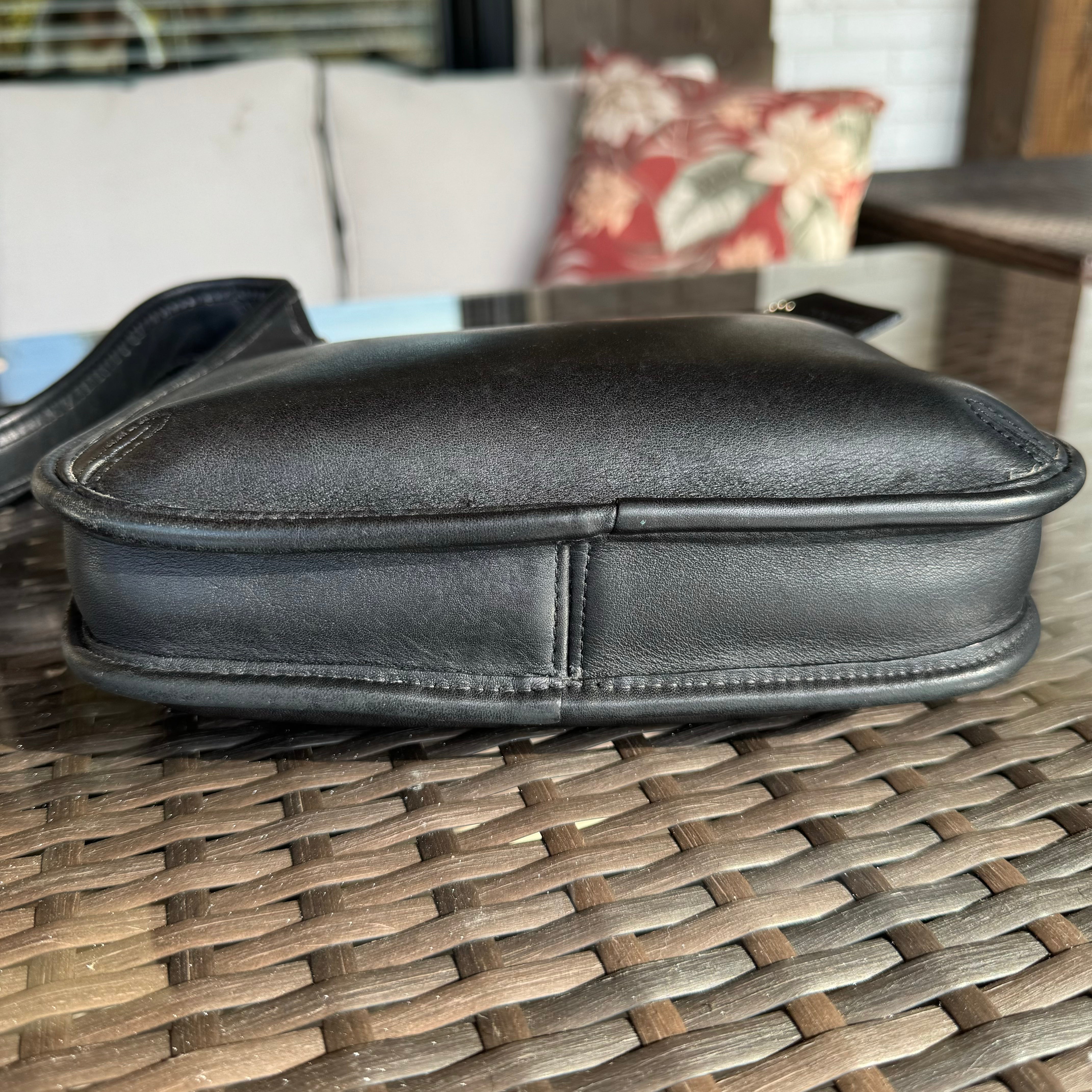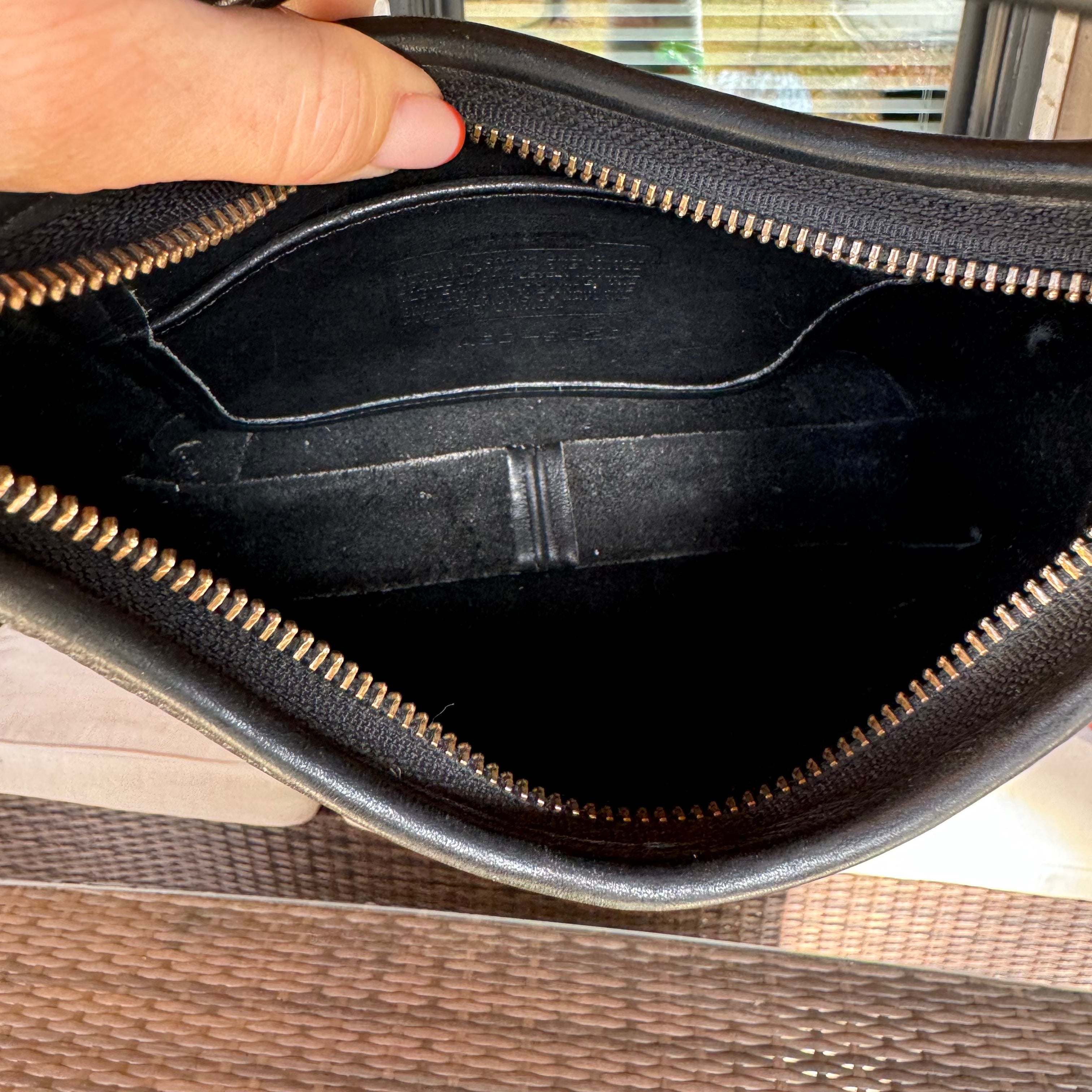 Vintage Coach Black #9020 Mini Ergo Zip in beautiful condition with some minor surface scratches. Hangtag present. Made in 1998 in the USA. She was vacuumed cleaned on the surface with leather CPR and solid brass hardware cleaned with sunshine cloth and brasso.