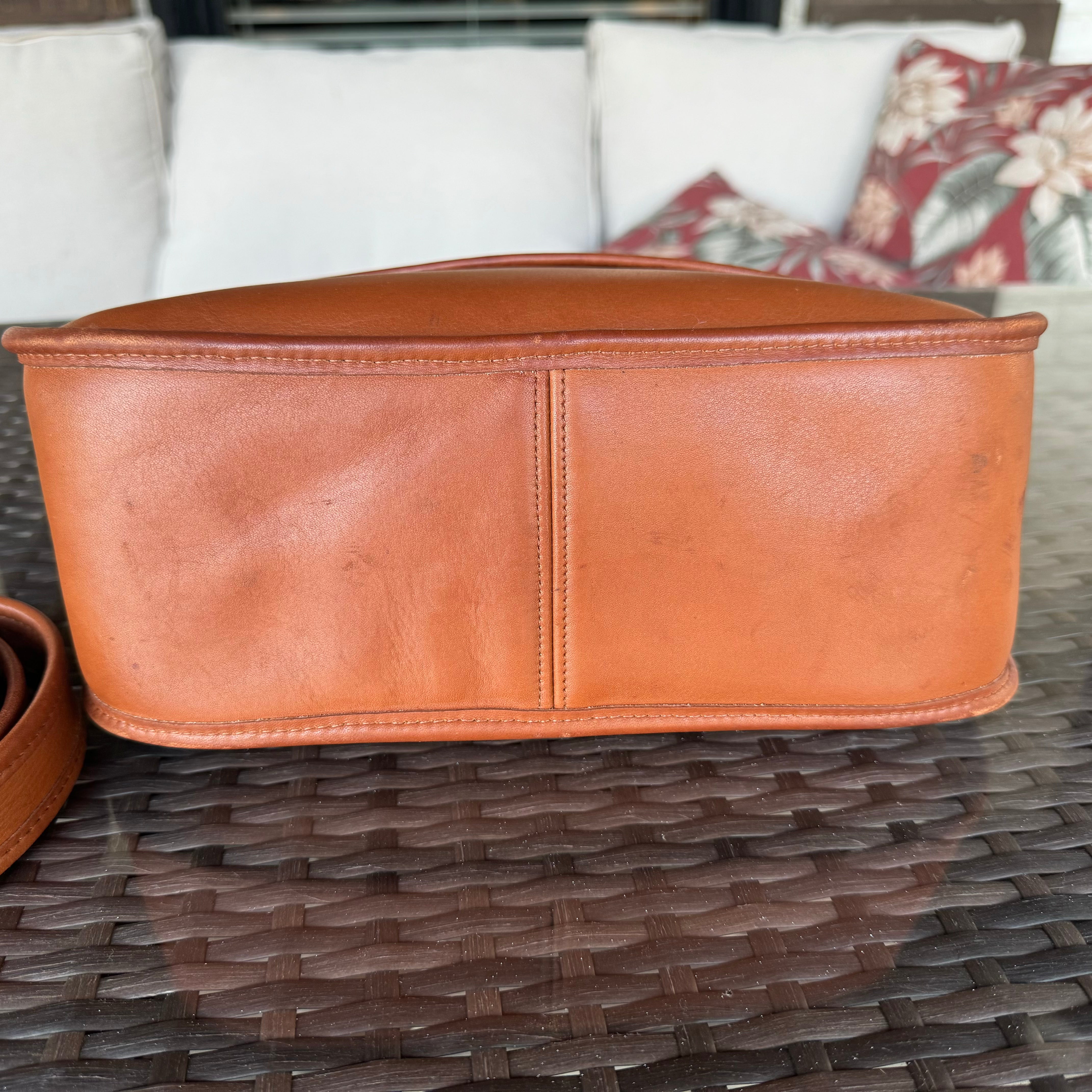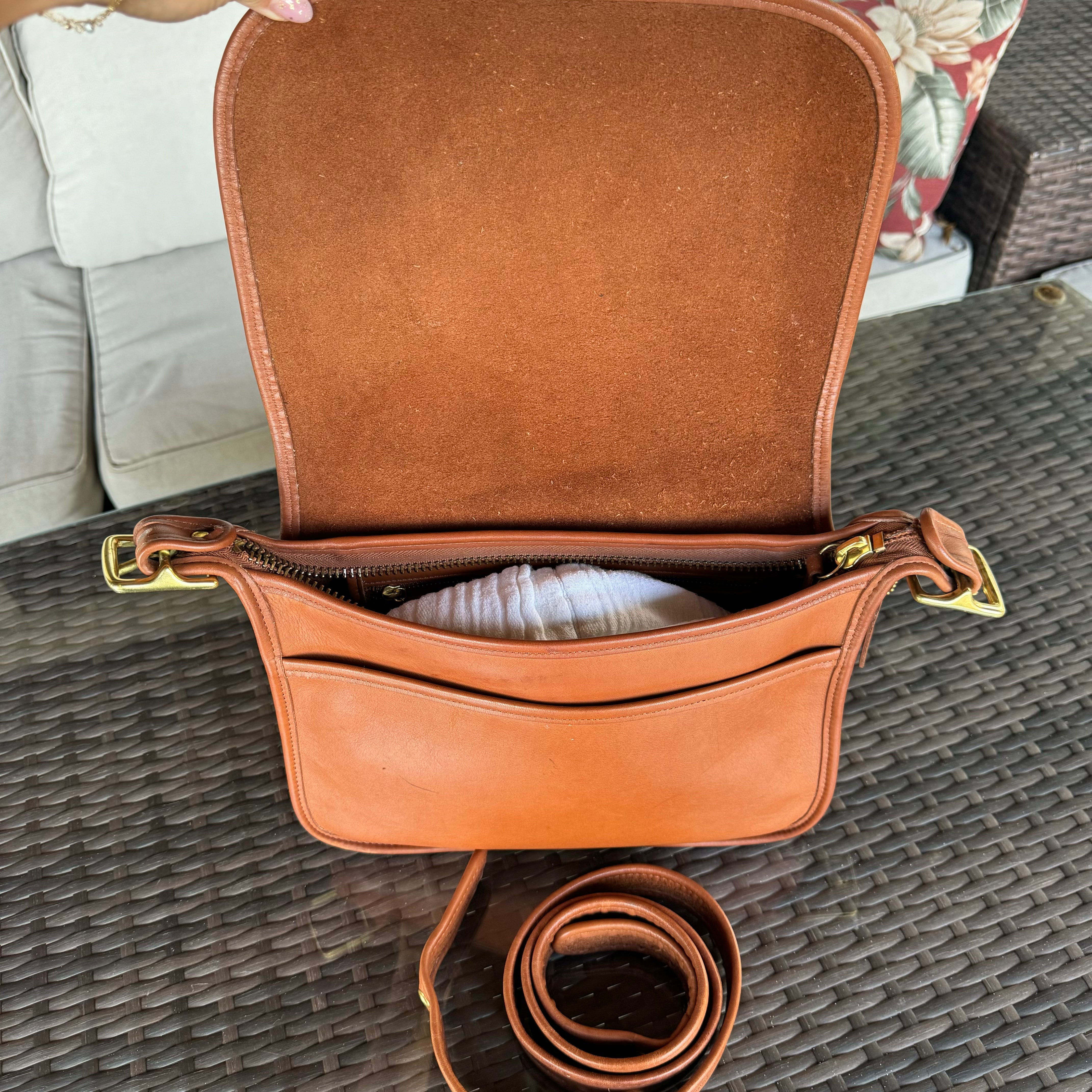 Vintage Coach British Tan Patrica’s Legacy #9951 made in 1995 in the USA. Original hangtag present. This bag is clean with no tears but she does have some stains and markings. Scuffs on the bottom, small stains and markings to her flap and under her flap. Pictured in photos. She is still in beautiful vintage condition with a lovely, soft, thick leather feel.Β