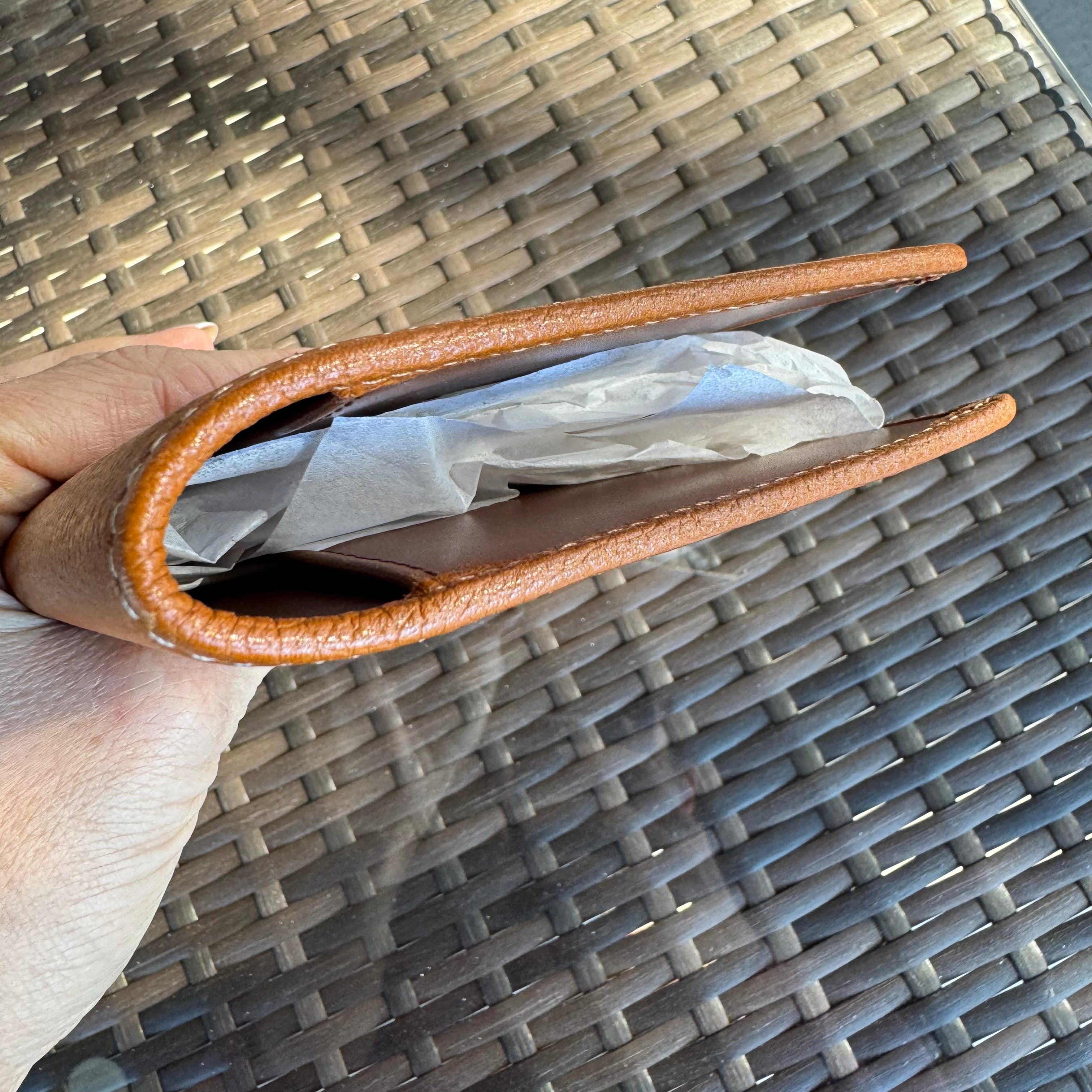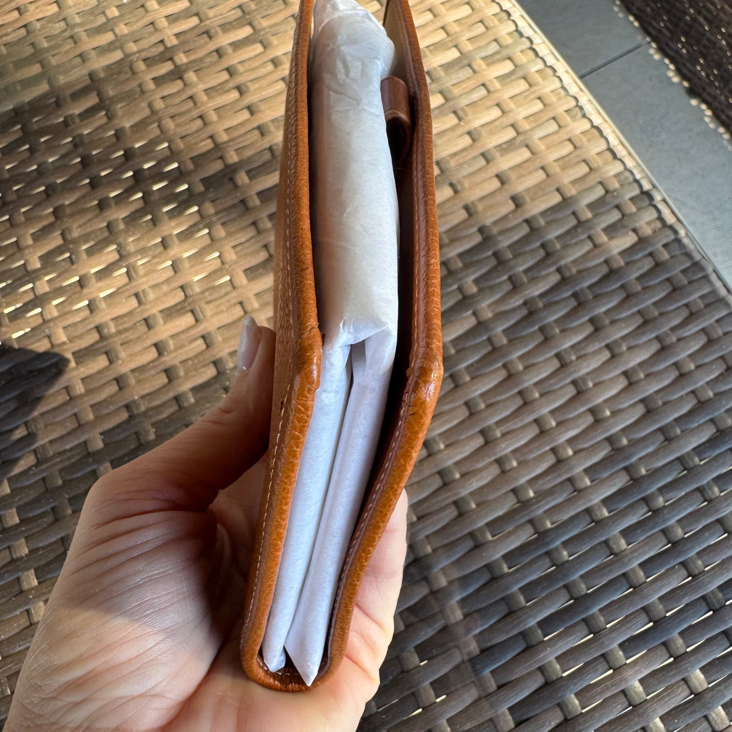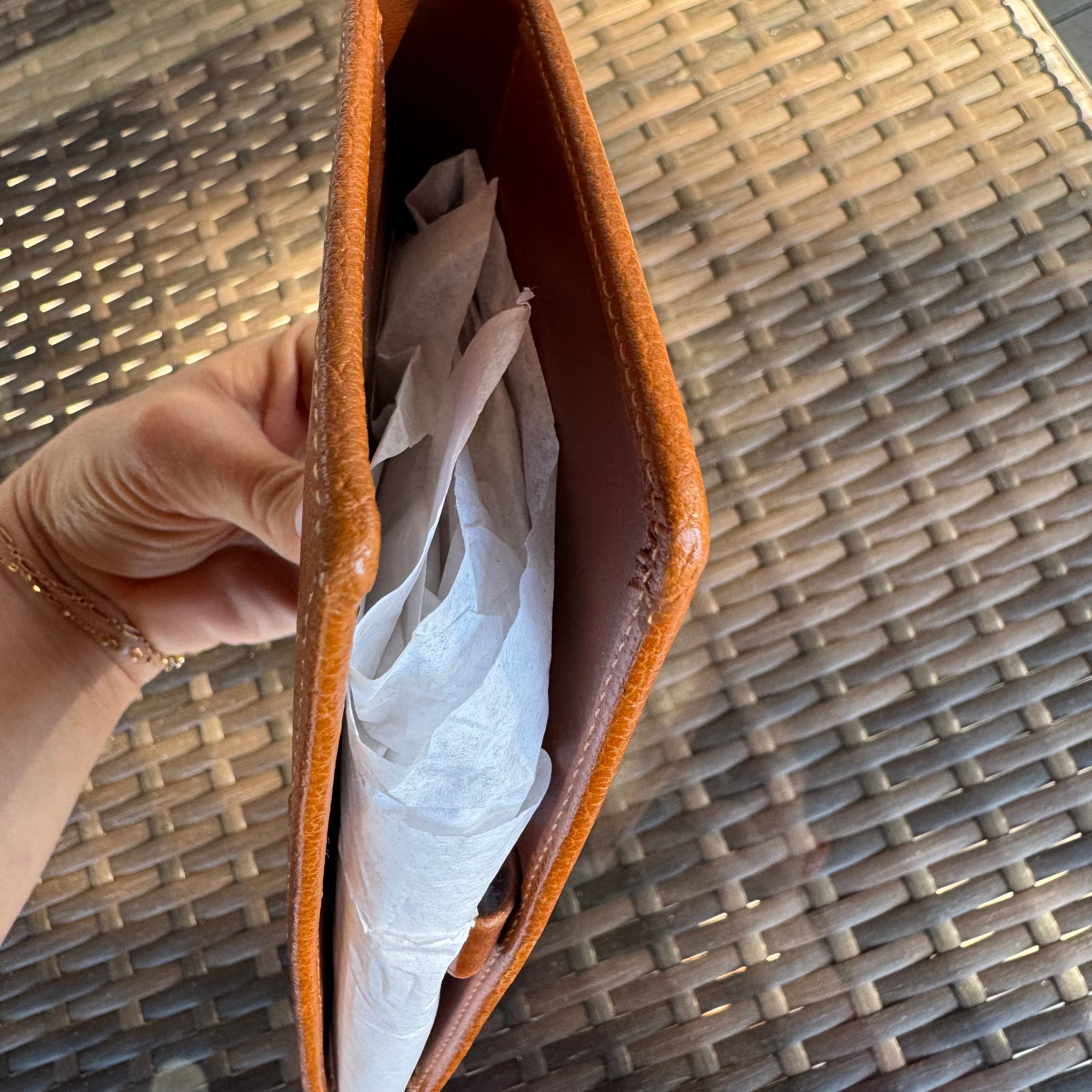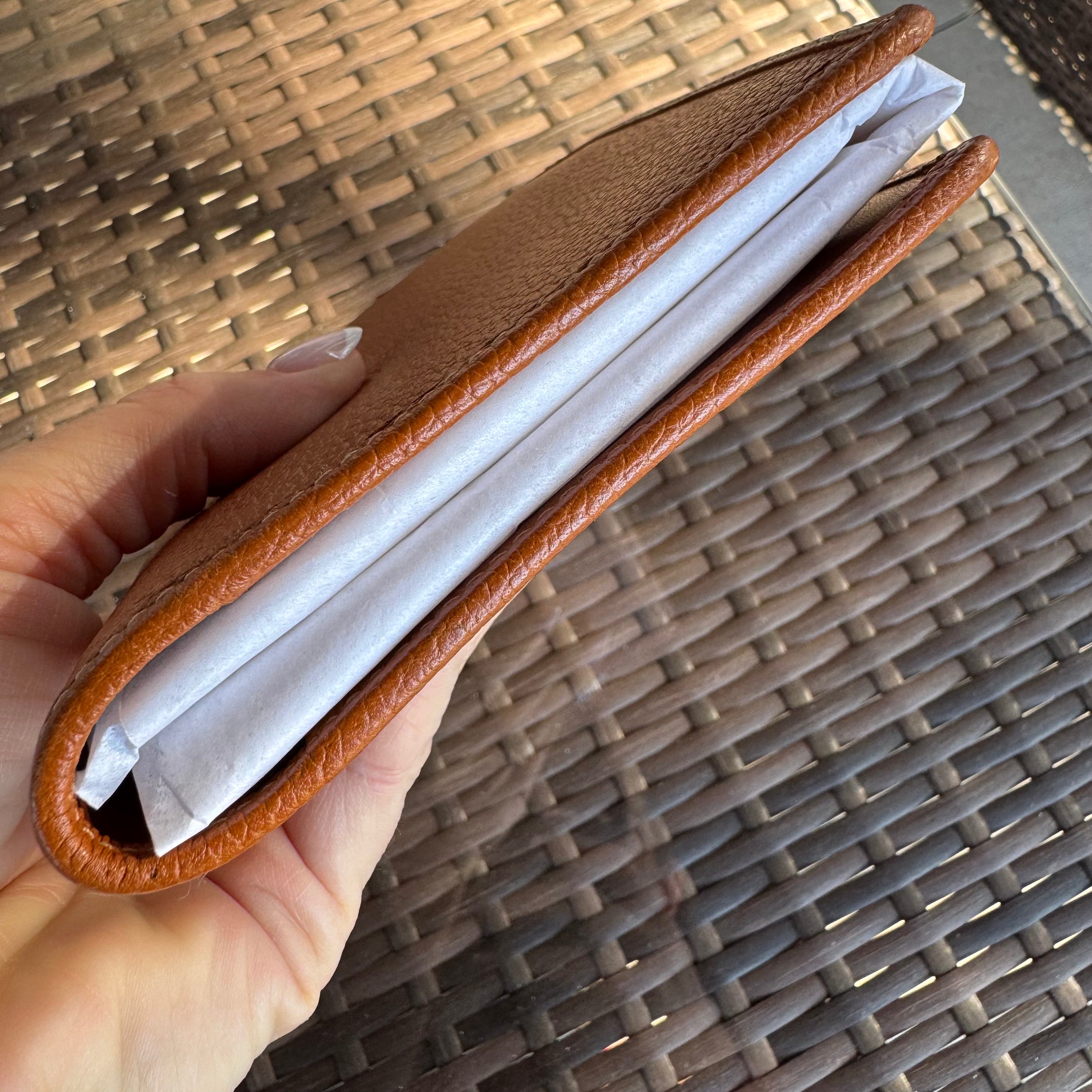 British Tan grainy, pebbled leather. Smooth calfskin leather lines the inside of this piece with two full-length inside pockets. Gold Coach embossing on outside.