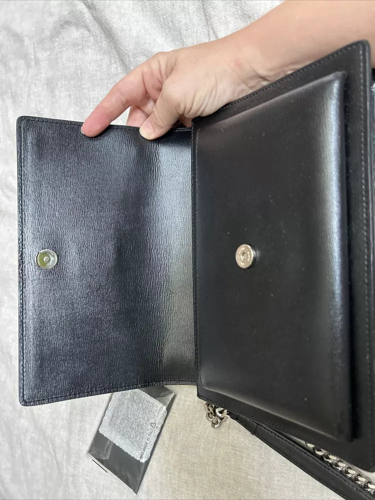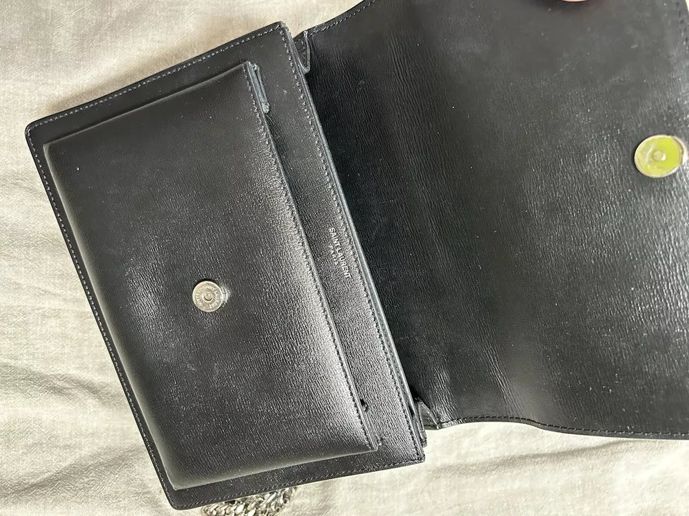 Authentic YSL Saint Laurent Sunset Medium Shoulder Bag in Black Leather. Sleek and sophisticated with a signature chain strap and timeless design.